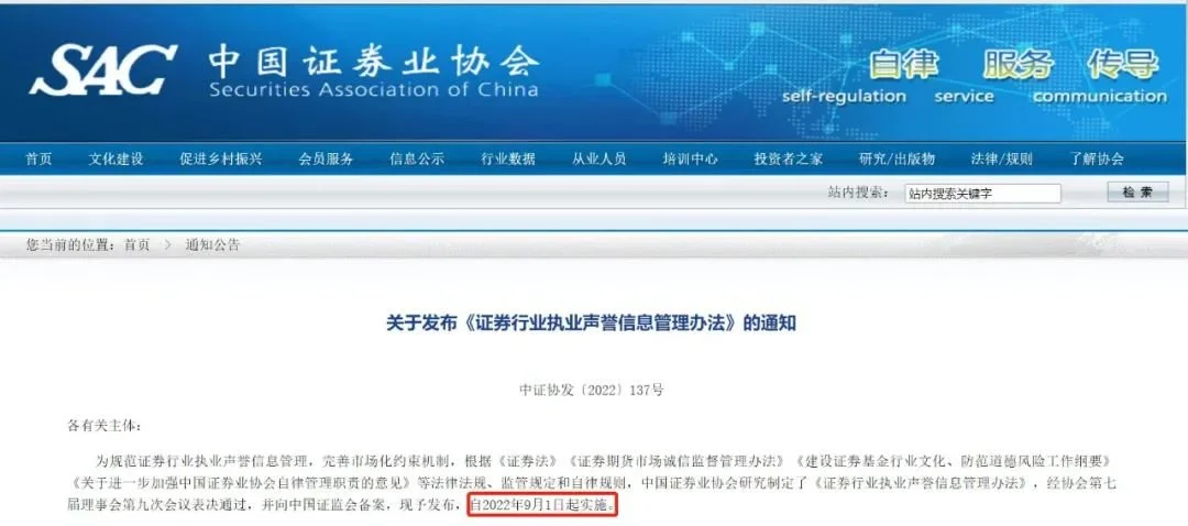 9月1日,《证券行业执业声誉信息管理办法》(下称《管理办法》)正式实施。与此同时,中国证券业协会(下称协会)也同步更新了从业人员的公示信息栏目。公示信息在原来的基础上,新增了“表彰奖励”“违法失信”“其他正面信息”“其他负面信息”等栏目。