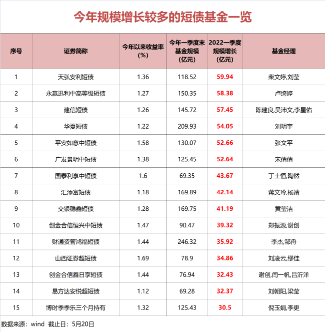 Wind数据显示,今年一季度短期纯债基金规模便激增1000亿元,总规模从去年末4900.53亿元增至5908.17亿元。截至5月21日,今年以来共发行了33只短债基金,也是去年同期发行数量的5.5倍。