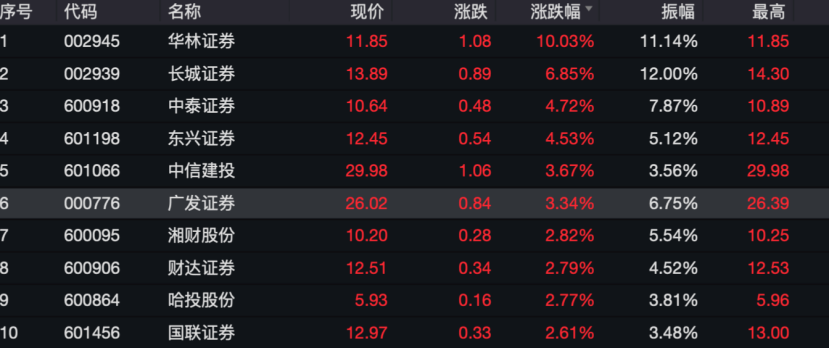 12月8日,券商股再度集体上涨,华林证券涨停,长城证券涨超6%,中泰证券涨超4%,中信建投、广发证券、湘财股份涨幅居前。