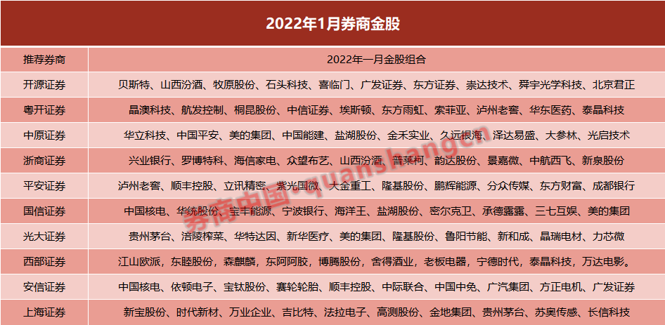 截至2021年12月31日,已有十余家券商发布2022年1月金股。