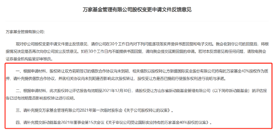 从证监会对万家基金股权变更的反馈意见来看,要求万家基金就以下四点问题在30日进行逐项落实并提供书面回复和电子文档。