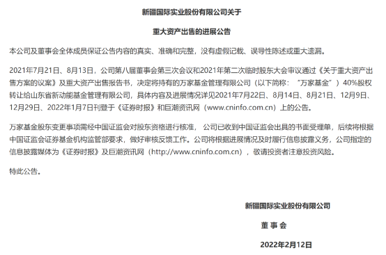而国际实业在2月12日也发布了关于重大资产出售的进展公告, 表示2021年7月21日、8月13日,公司第八届董事会第三次会议和2021年第二次临时股东大会审议通过《关于重大资产出售方案的议案》及重大资产出售报告书,决定将持有的万家基金40%股权转让给山东省新动能基金管理有限公司。