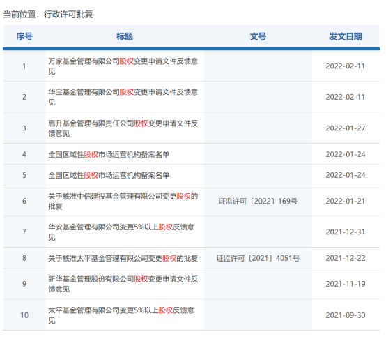 证监会网站信息显示,今年以来,除了万家和华宝基金,惠升基金、中海基金也获得了股权变更的反馈意见。